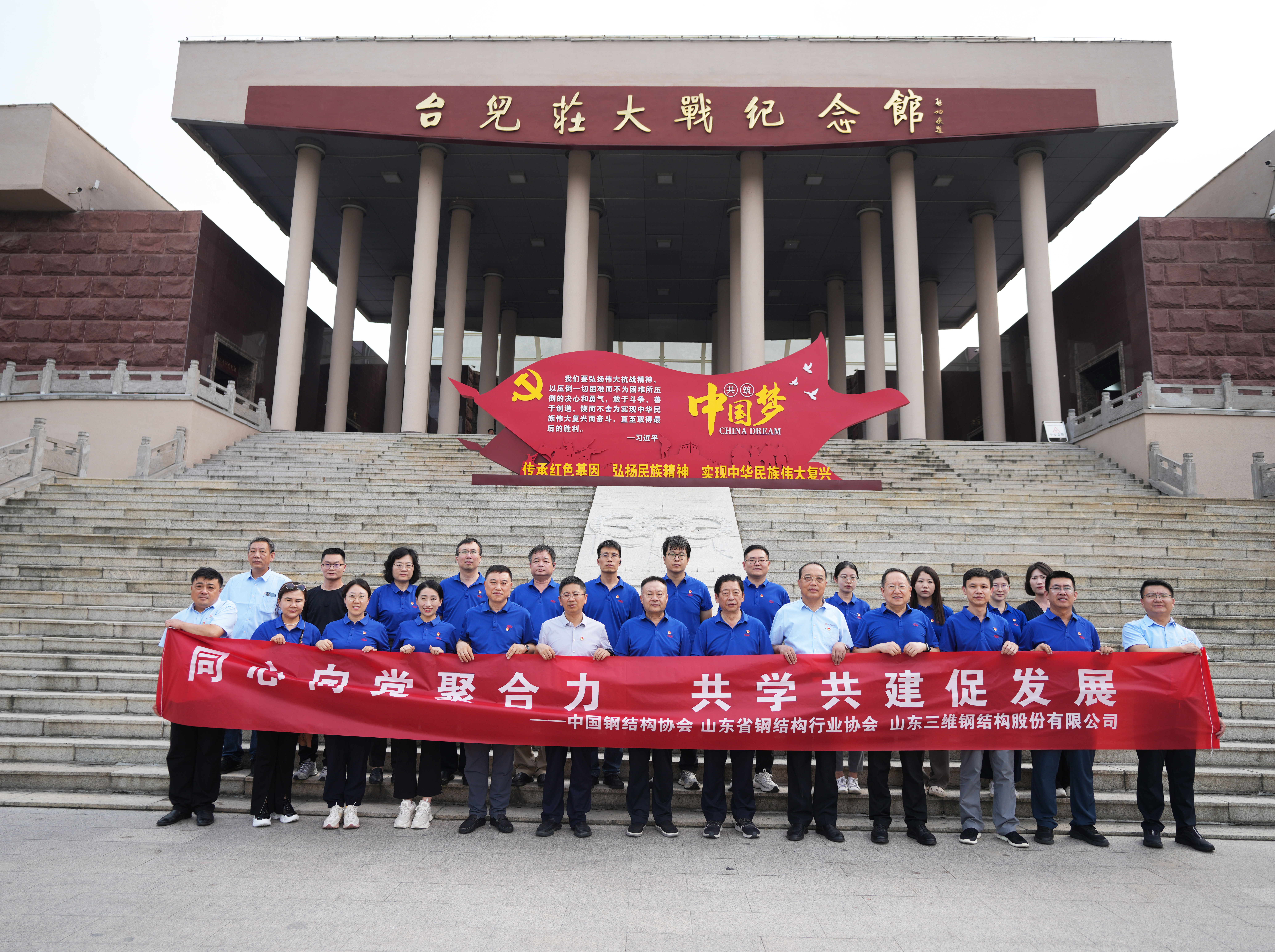 在紀念中國人民抗日戰爭暨世界反法西斯戰爭勝利80周年的重要歷史時刻,為深入學習貫徹黨的二十大精神,充分發揮協會黨建引領作用,加強黨員隊伍建設,提升黨組織號召力、凝聚力和戰斗力,中國鋼結構協會、山東省鋼結構行業協會與山東三維鋼構股份有限公司于2025年8月29日至30日共同開展黨建聯建活動。本次活動以“黨建引領聚合力,攜手共建促發展”為主題,通過企業黨建交流與紅色教育基地參觀學習相結合的方式,進一步增強黨性修養,凝聚行業力量。
