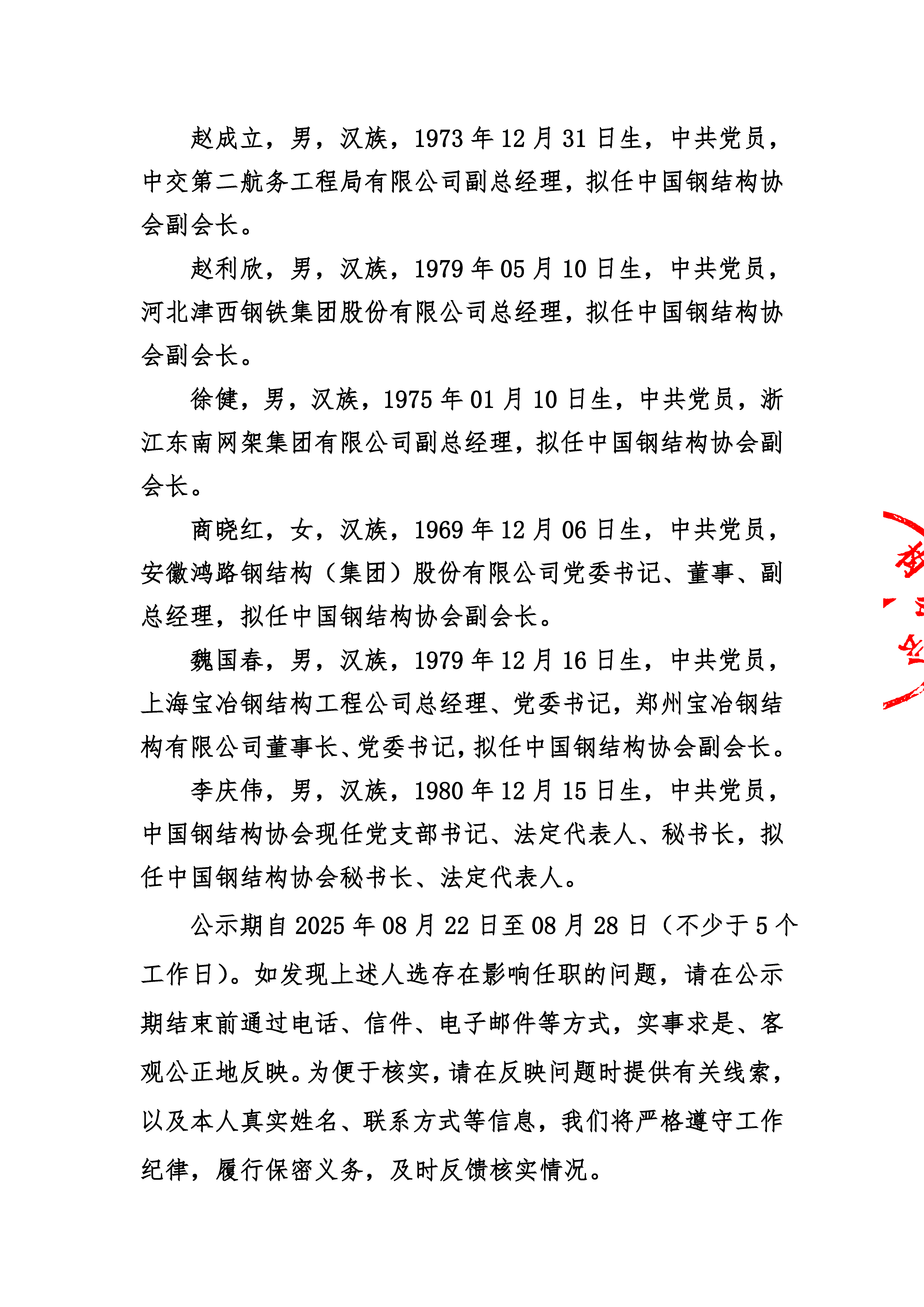 關于中國鋼結構協會第九屆理事會負責人人選的公示